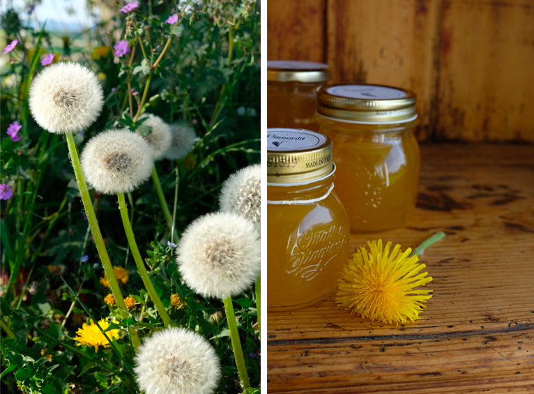 Hier était une journée d’avril si chaude et ensoleillée qu’on aurait pu être en juin. Après une après-midi passée au jardin j’ai vu mon chien rentrer le ventre jaune de s’être roulé dans les pissenlit. Les fleurs étaient gorgées de pollen et cela m’a donné envie d’en profiter moi aussi. On sait que la dent-de-lion est délicieuse en salade mais on connaît peut-être moins le goût de sa fleur. Je ne vais pas mentir, elle n’est pas aussi aromatique que celle du sureau, mais son petit goût floral est délicat et sucré. Je suis descendue dans le verger devant la maison qui est jaune de fleurs et en ai cueilli quelques dizaines pour les transformer en gelée. Il faut détacher tous les pétales avant de les faire cuire. La tâche est un peu ardue mais le résultat est magnifique. La couleur est le plus impressionnant, de jolis pots jaunes, presque une gelée royale offerte par la prairie!