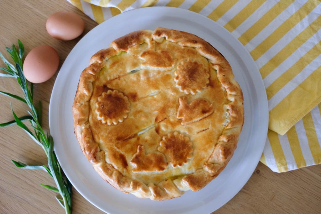 Dans un moule à gâteau à bord haut, disposer la première pâte feuilletée et piquer le fond avec une fourchette. Verser la farce à l’intérieur et y creuser quatre petits puits. Casser un oeuf à l’intérieur de chacun. Couper la deuxième pâte de la dimension du moule et la disposer délicatement sur la farce en rabattant le bord de la première pâte par dessus. Tailler quelques ouvertures pour laisser sortir la vapeur et badigeonner d’un peu d’oeuf battu. J’ai emportepiécé les chutes de pâte pour la décoration.