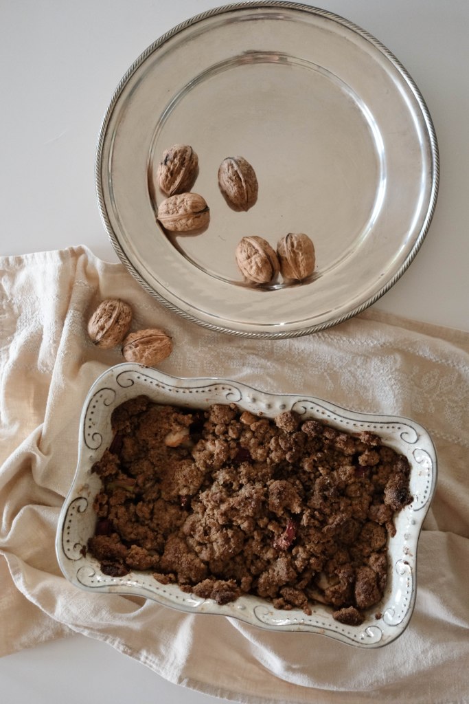 Pour le crumble mélanger le sucre, la farine, et le nillon dans un bol. Incorporer le beurre coupé en petits cubes, mélanger du bout des doigts jusqu’à ce que toutes les poudres soient incorporées dans le beurre en petits amas de pâte.