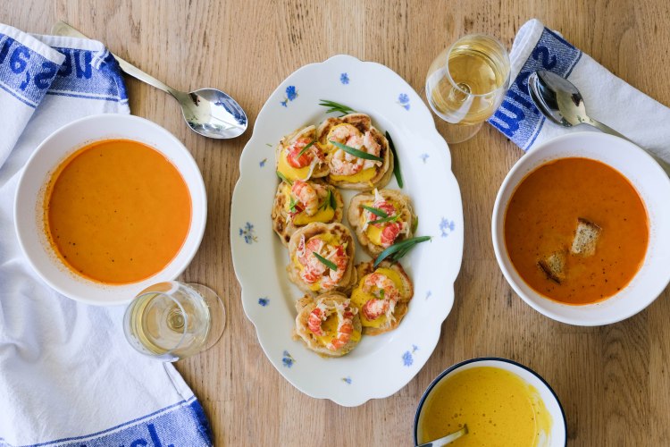 Quand la bisque est prête, filtrer dans une plus petit casserole, ajouter la crème, assaisonner et servir avec les croutons, la rouille et quelques feuilles d’estragon.