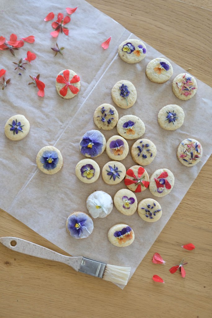 Dès la sortie du four, quand les biscuits sont encore chauds, brosser le dessus avec un pinceau légèrement mouillé. Poser une fleur sur le biscuit et presser délicatement du bout des doigts jusqu’à ce que la fleur attache. Procéder un biscuit après l’autre sinon l’eau s’évaporera!