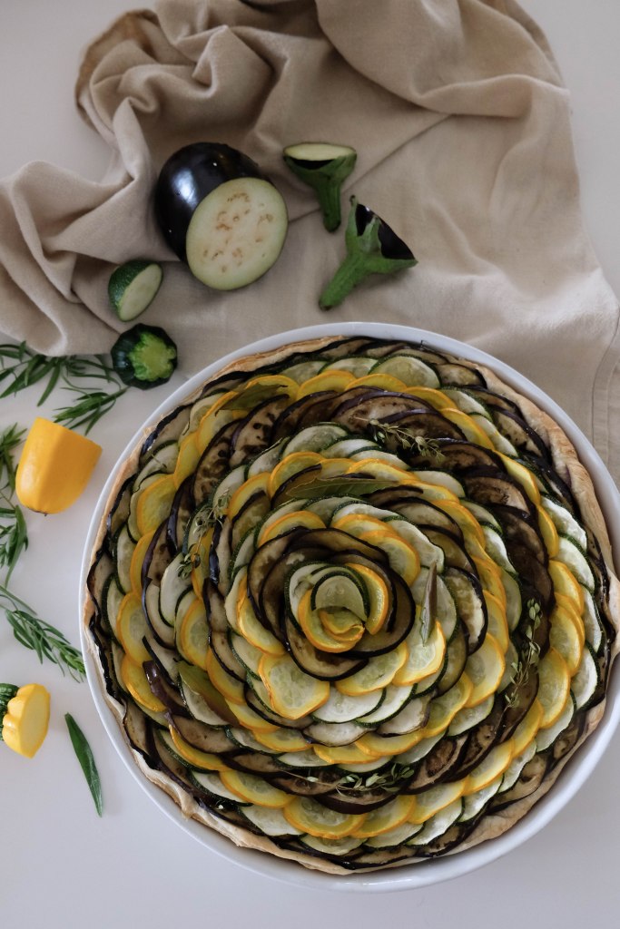 Cette belle tarte est une des nombreuses recettes de Mimi Thorisson que j’adore et que je cuisine régulièrement l’été quand j’ai toujours quelques courgettes et aubergines dans le frigo. J’ai un peu adapté la recette selon mes goûts et ai notamment changé la pâte pour une pâte feuilletée que je trouve plus légère.