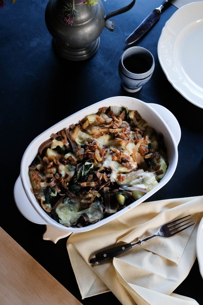 Les Pizzoccheri sont des pâtes à la farine de sarrasin typique de la région de la Valtellina en Italie, mais aussi des Grisons où je passais toutes mes vacances quand j’étais enfant. C’est là que je les ai découverts. On les mange en gratin avec des pommes de terre et du fromage, un vrai plat de montagnard! Voilà la recette comme j’aime la faire.