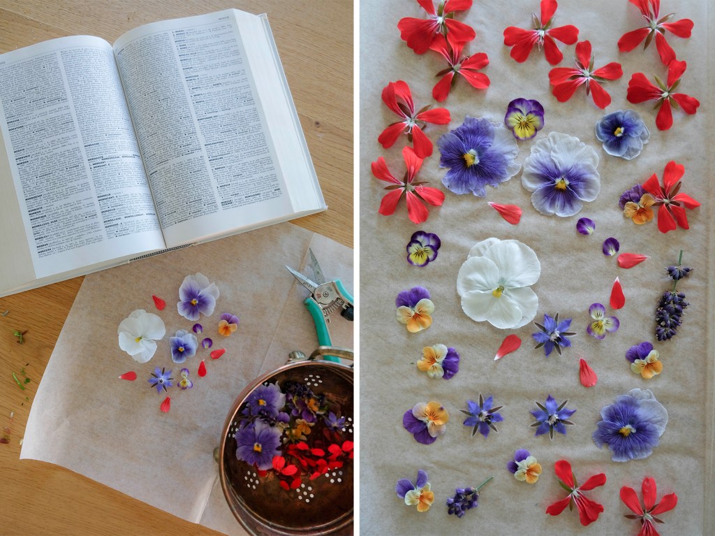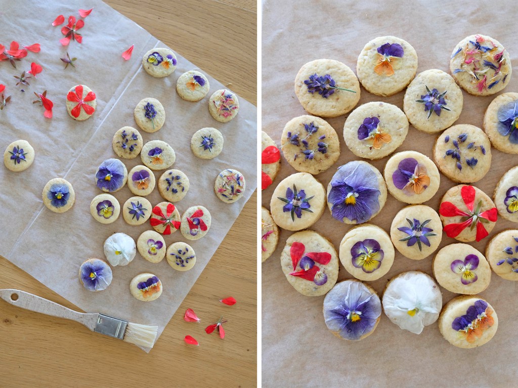 L’idée m’est revenue avec une fournée de biscuits. En voyant la recette en ligne j’ai trouvé l’idée parfaite comme cadeau d’anniversaire pour ma belle-maman. J’ai donc fouillé le jardin à la recherche des plus belles fleurs comestibles: bourrache, géranium, lavande et surtout les si délicates pensées, mes préférées pour cette utilisation. On les passe sous presse quelques heures avant de les coller sur les biscuits chauds avec un peu d’eau et le tour est joué.