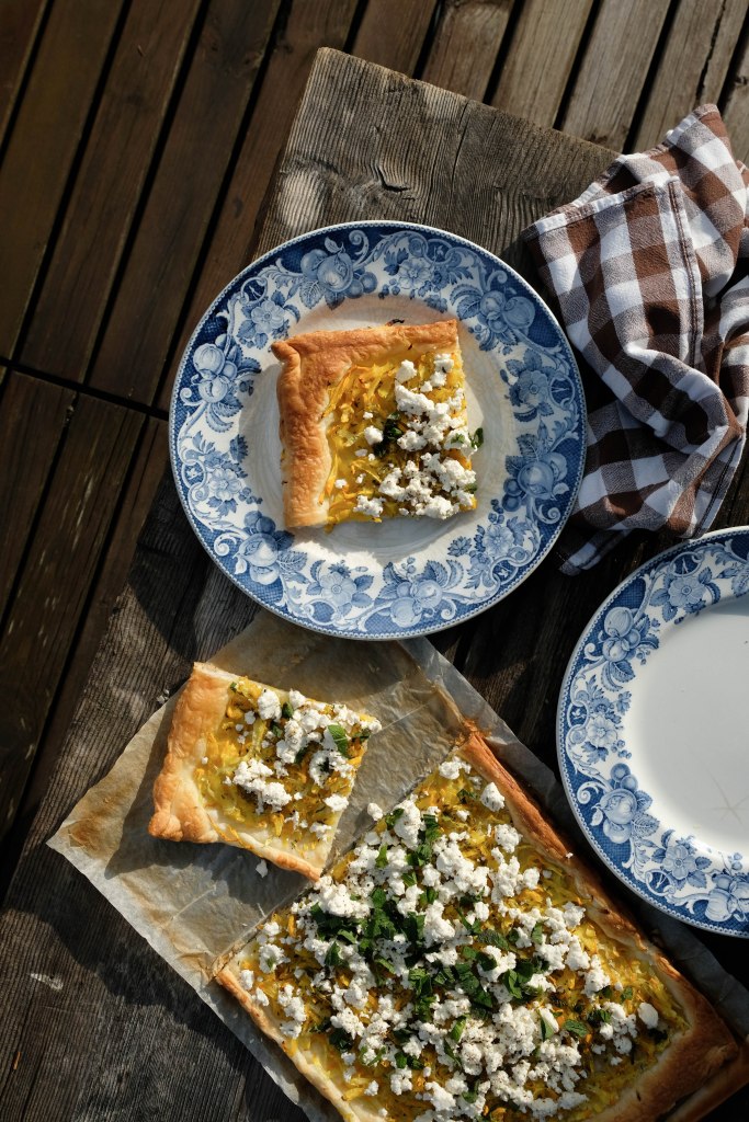 Enfourner pour 25 minutes environ, jusqu’à ce que la pâte soit bien dorée. Dès la sortie du four, émietter le sérac sur la tarte et saupoudrer de menthe fraîche ciselée. Rectifier l’assaisonnement si besoin.