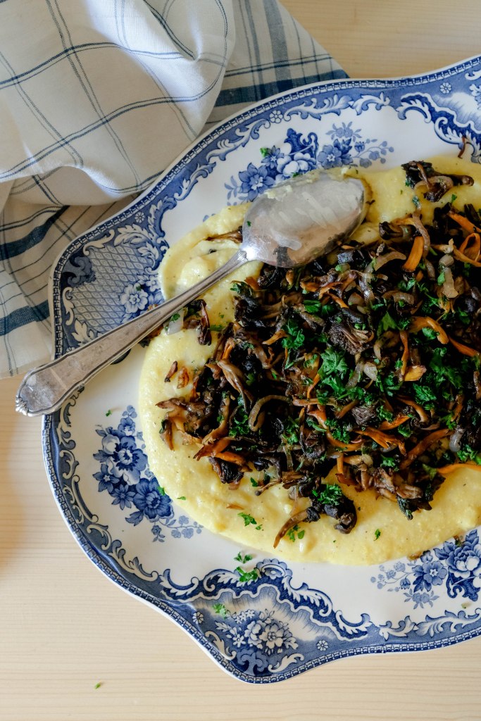 Quand la polenta est cuite, ajouter le vacherin Mont d’Or en petits cubes. Remuer avec une cuillère en bois jusqu’à ce qu’il soit fondu. Verser la polenta dans le plat de service, disposer les chanterelles par-dessus et une pincée de persil supplémentaire.