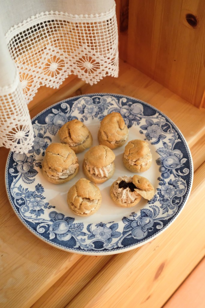 A la sortie du four, laisser refroidir les choux puis les couper en deux. Les garnir avec la crème à la ricotta et des petits cubes des gousses d’ail restantes. Servir au plus vite.