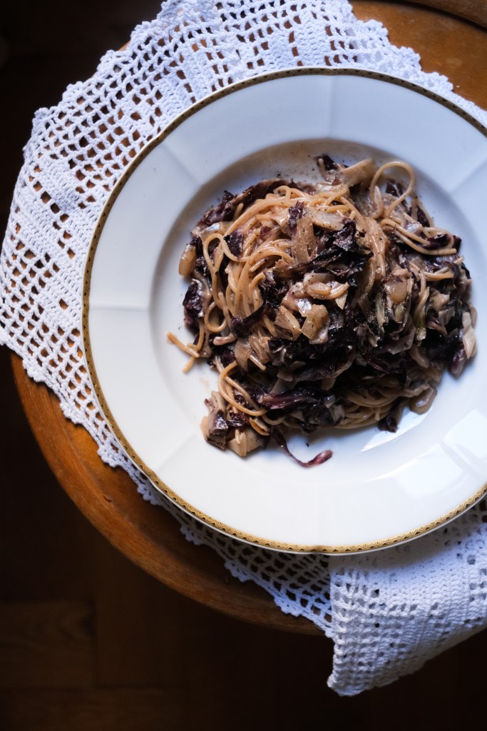 Une recette transmise par un ami aussi gourmand que moi. La douceur de l’oignon caramélisé et du cognac se marient à l’amertume du radicchio. Peut-être ma façon préférée de préparer un plat de pâtes!