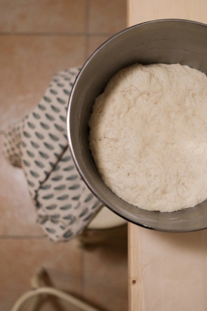 Former une boule avec la pâte et la remettre dans le bol. Couvrir avec un linge humide et laisser reposer une heure, à température ambiante ou mieux, en-dessus d’un radiateur, jusqu’à ce que la pâte ait doublé de volume.