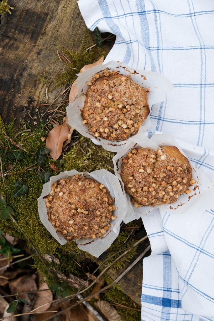 Pour le topping, faire fondre une grosse cuillère de beurre, le verser dans un bol et mélanger avec le sucre brun, la farine de sarrasin et le sarrasin soufflé. Répartir sur les muffins et enfourner pour 15 à 20 minutes, jusqu’à ce qu’ils soient bien gonflés et dorés.