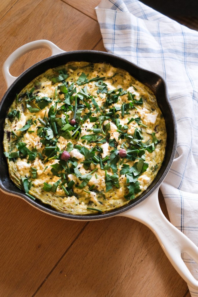 Une recette que j’aime beaucoup servir pour un brunch mais qui est aussi délicieuse en plat principal avec une salade. Adaptez-là en fonction de ce que vous avez dans le frigo ou ajoutez-y des pommes de terre pour un plat plus roboratif.
