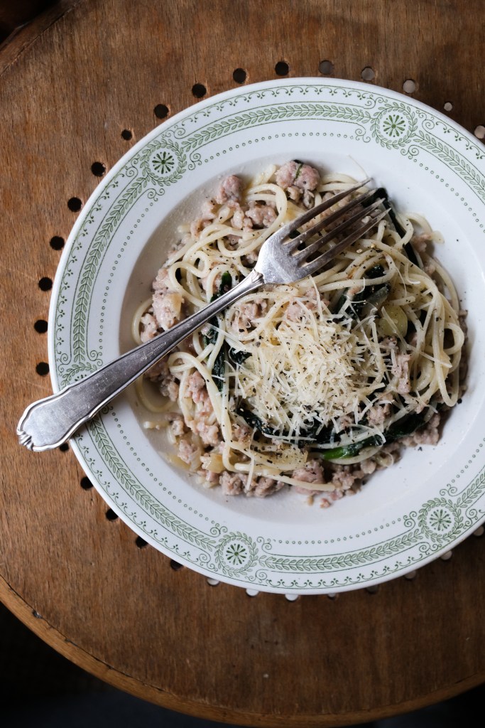 Ajouter les spaghetti et la moitié du parmesan râpé dans la poêle et les mélanger avec les autres ingrédients. Incorporer un peu d’eau de cuisson pour lier le tout. Saler, poivrer et servir immédiatement, avec le reste du parmesan.