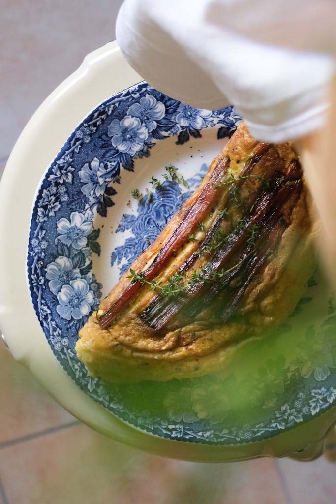 Quand les côtes de bette sont cuites, les disposer de manière parallèle dans la poêle et ajouter un morceau de beurre. Verser l’appareil aux oeufs par-dessus. Recouvrir du reste de gruyère râpé et enfourner sous la grille quelques instants, jusqu’à ce que le fromage soit fondu et commence à dorer et que l’omelette soit bien soufflée.