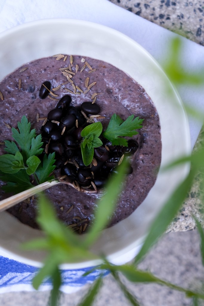 Verser dans un bol, décorer avec les haricots et quelques graines de cumin.