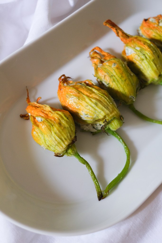 Déposer les fleurs dans un plat allant au four, recouvrir d’un filet d’huile d’olive et enfourner pour 10 à 15 minutes, la farce se sera raffermie et les fleurs seront légèrement dorées.