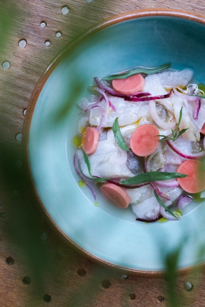 Au moment de servir, émincer l’oignon le plus finement possible et répartir quelques tranches sur le ceviche. Décorer avec les tranches de radis au vinaigre, les feuilles d’estragon. Terminer avec un filet d’huile d’olive et une pincée de sel et de poivre.