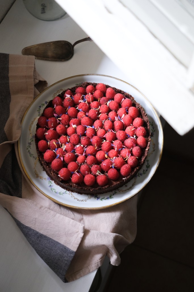 Au moment de servir, ouvrir très délicatement le moule et le retirer. Décorer de jolies framboises entières et de fleurs séchées.
