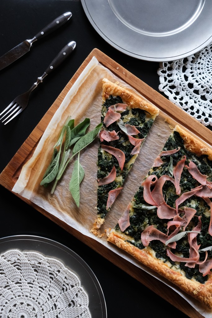 Sortir du four et déposer le jambon et les feuilles de sauge sur la tarte. Assaisonner et remettre au four pour 5 à 10 minutes, le temps que le jambon devienne croustillant.