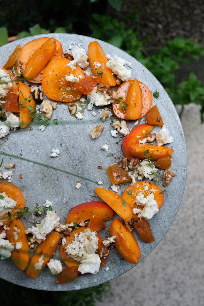 Découper les abricots en rondelles et en quartiers. Détailler les abricots secs en petits cubes. Les disposer sur le plat de service et émietter le sérac par-dessus. Décorer avec les cerneaux de noix grossièrement concassés et les feuilles de thym frais.