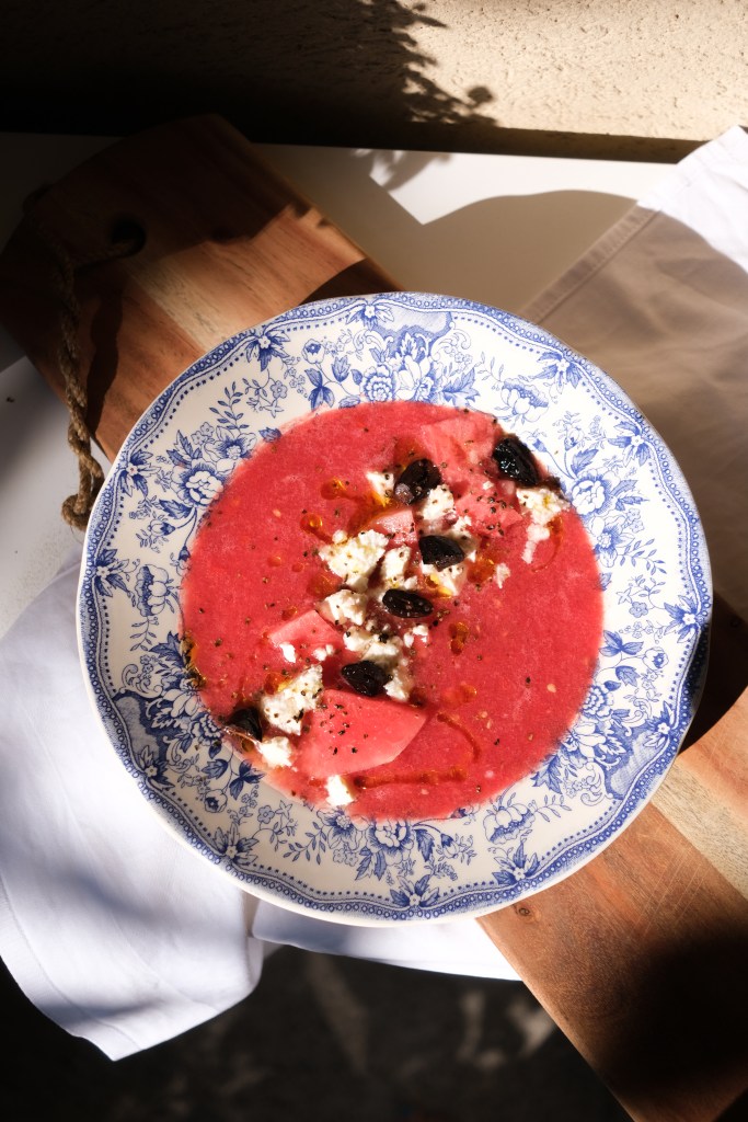 Verser dans les bols, décorer de morceaux de pastèque, de sérac émietté et des olives noires. Terminer avec un trait d’huile d’olive, un peu de fleur de sel et du poivre.