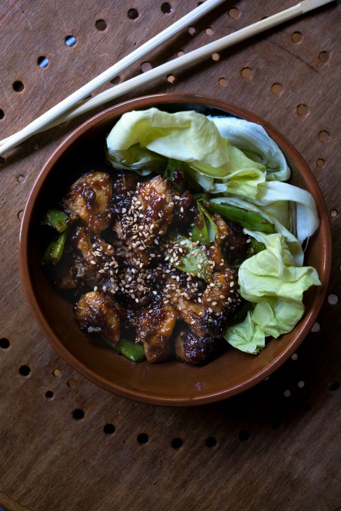 Servir saupoudré de sésame, avec selon vos goûts quelques feuilles de salade, des pois gourmands à la vapeur, du riz nature, ou tout cela à la fois!