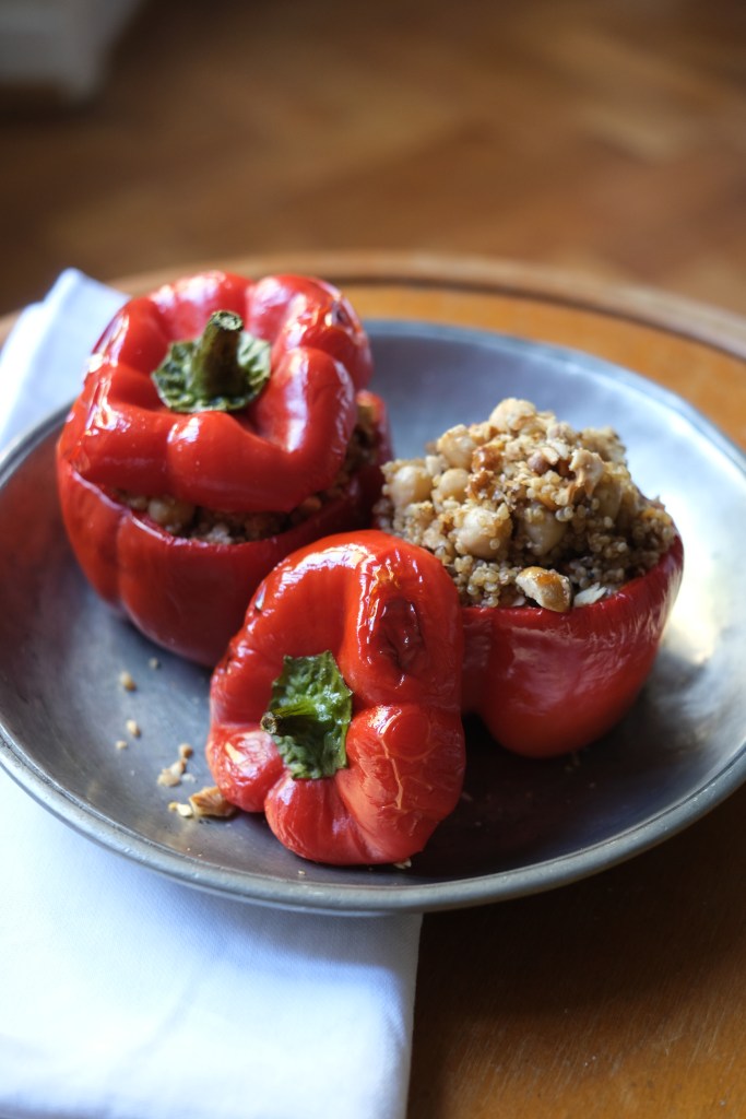 Quand les poivrons sont cuits les farcir avec le quinoa. Recouvrir des chapeaux et servir immédiatement.