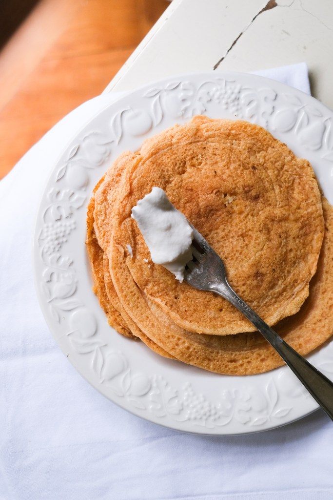 Des crêpes simplissimes et pleines de bonnes protéines. Je les sers avec de la crème fraîche végétale, des légumes grillés, du houmous, ou tout ça à la fois!