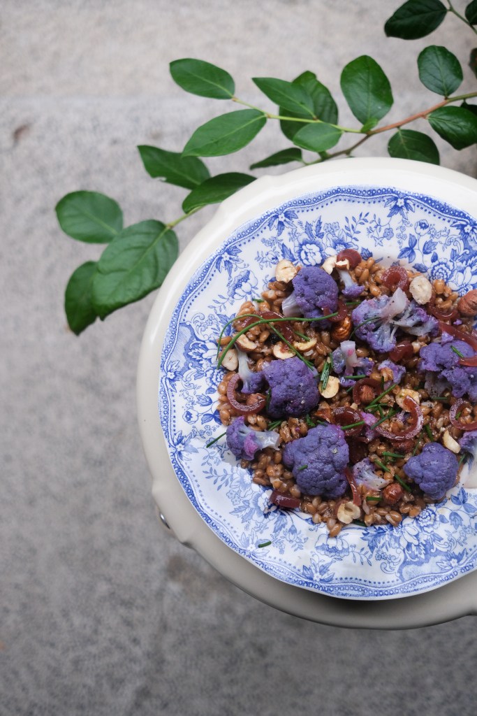 Une salade d’automne qui prend tout son relief quand on la prépare avec un chou fleur violet, parce que j’en suis persuadée, on mange aussi avec les yeux. J’aime la préparer avec une vinaigrette à la moutarde de bénichon, pour la petite dose d’épices dont on a tous besoin quand les jours se refroidissent.