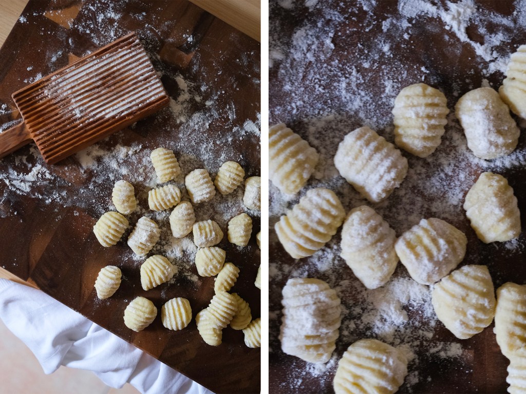 Couper la pâte en 4 et en faire des boudins, de l’épaisseur d’un pouce environ. Les détailler en petits tronçons pour obtenir les gnocchi. Les rouler délicatement dans la farine. Les gnocchi peuvent être cuisinés comme ça, ou roulés sur une fourchette ou une planche à gnocchi pour obtenir des rainures qui accrocheront mieux la sauce.
