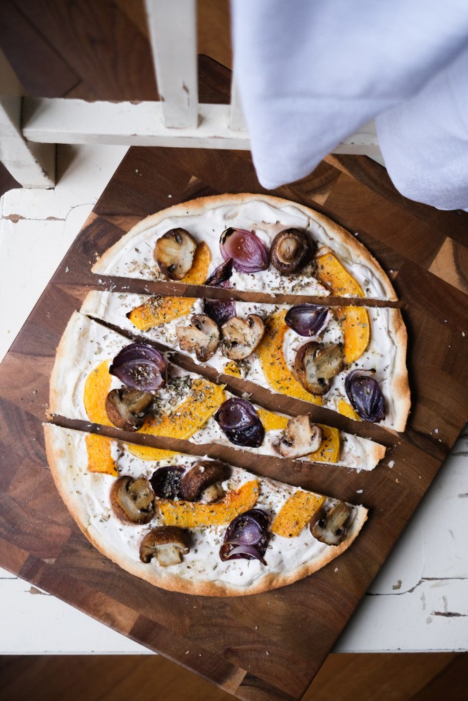 Etaler finement la pâte et la disposer sur une plaque chemisée de papier sulfurisé. La recouvrir de crème, puis des tranches de courges, des oignons et des champignons. Enfourner pour une dizaine de minutes jusqu’à ce que la pâte soit bien dorée et croustillante.