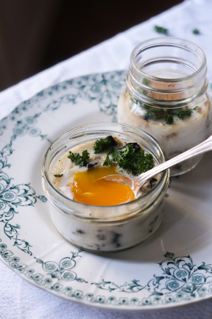 Déposer les champignons au fond des ramequins. Si vous n’en avez pas utilisez une tasse qui résiste bien à la chaleur, ou comme moi des bocaux à confiture. Recouvrir avec la crème au Mont d’Or puis casser un oeuf dans chaque contenant.