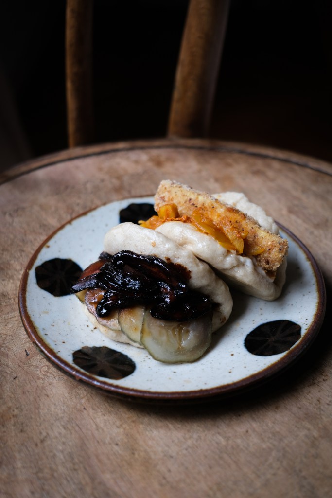 Garnir les bao de tofu pané et de kimchi ou de champignons laqués et de pickles de concombre.
